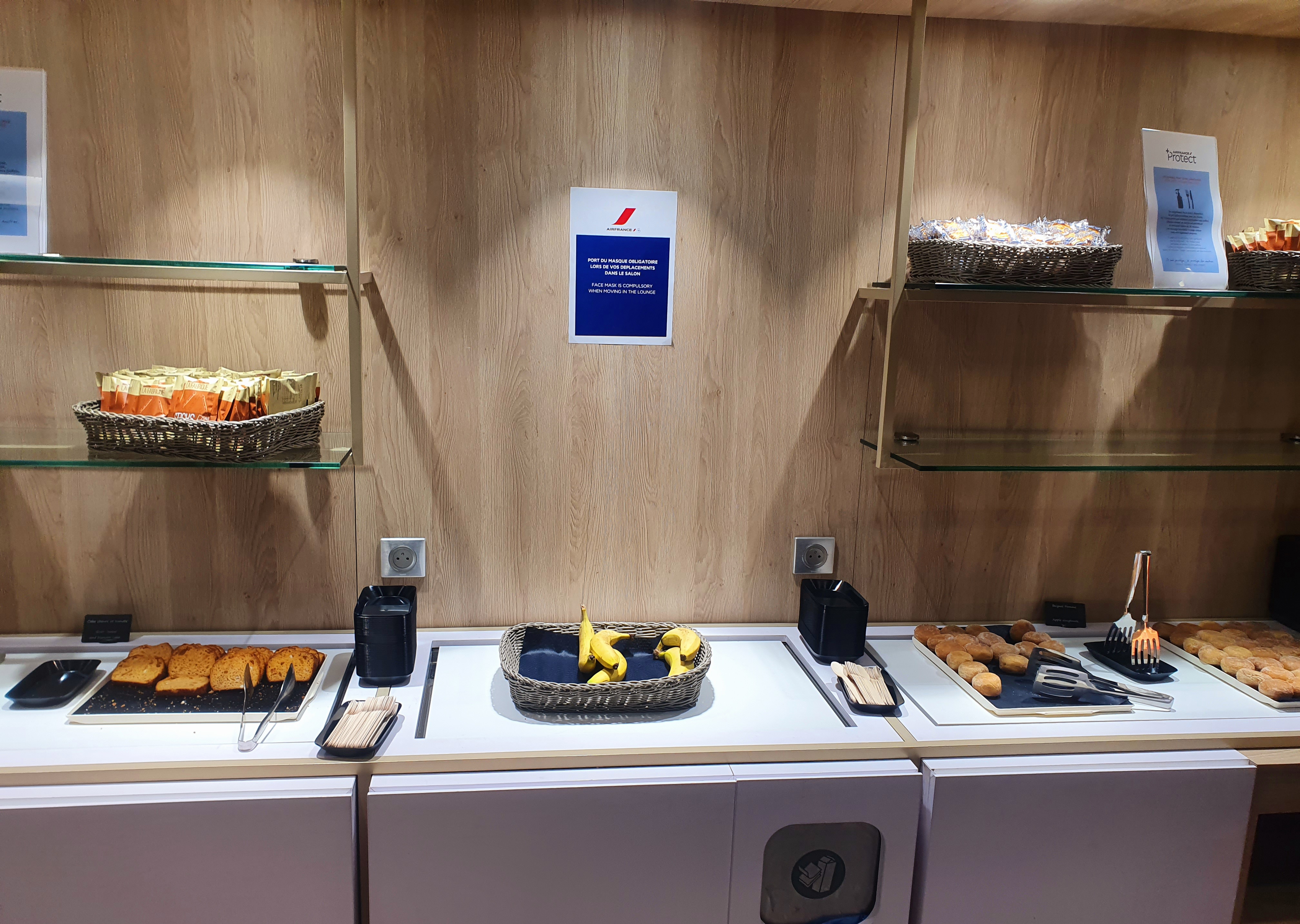 Posté le 05/03/2020 à 18:00" Élégant salon Air France pour les passagers de la classe affaires et de Sky Team Elite Plus. Le petit déjeuner est servi ici le matin (jusqu'à ~12h00). Rien de spécial - petit déjeuner continental classique français - uniquement des plats froids, pâtisseries, assortiments de confitures. Uniquement expresso ou café américain provenant des machines à café, lait - séparément. Large choix de rafraîchissements en petites cannes. Pas de boissons alcoolisées, y compris le champagne :((( Pas de toilettes dans le salon :((( "