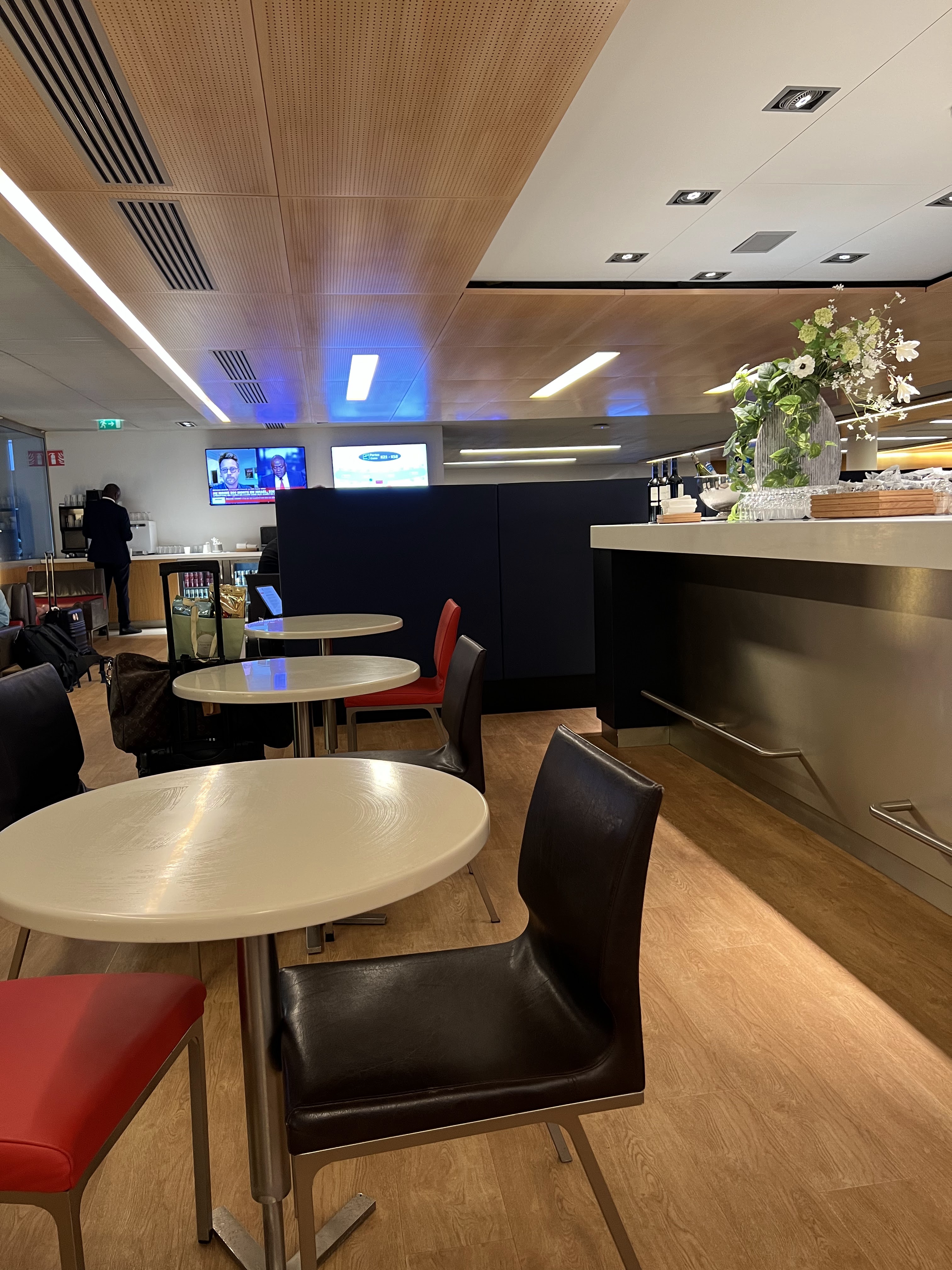 Le côté bar / nourriture est de bonne qualité mais le salon manque toujours de place aux heures d'affluence. Une extension est à envisager ainsi qu'une modernisation comme les salons des portes L et M. Même celui du 2G est plus moderne